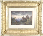 Artist: William de Goumois (19th C. Swiss) Title: “Moonlight Over the Castle” Media: Watercolor on Paper Size: 7-1/2 x 11 in (approx.) Year of Creation: 1878