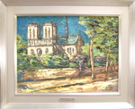 Artist: Preben Rasmussen (b. 1919) Title: “Notre Dame I” Media: Oil on masonite Size: 13-7/16 x 17-7/16 in., w/o frame. Year of Creation: Mid 20th C